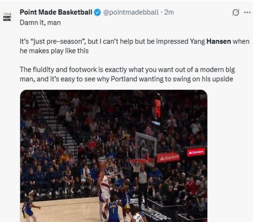 虽说这 “只是季前赛”,但看到杨瀚森打出这样的表现,我还是忍不住被圈粉。