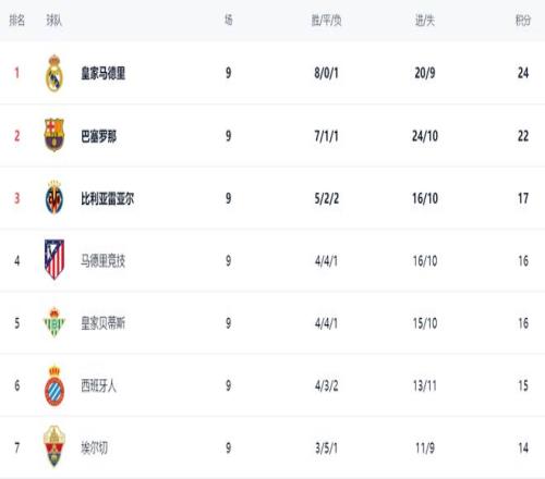 在积分榜上,皇马再次登顶。皇马8胜1负,拿到了24分。巴萨紧随其后,7胜1平1负的战绩,拿到22分。比利亚雷亚尔以17分排名第3。第4的是马竞,4胜4平1负,拿到16分。皇家贝蒂斯也是16分,排名第5。西班牙人以15分排名第6。
