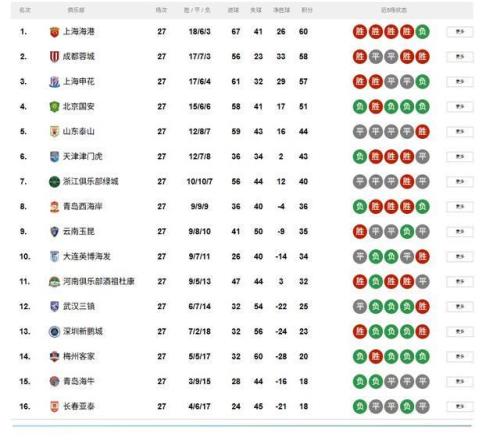 中超积分榜(来源:中足联官网)
