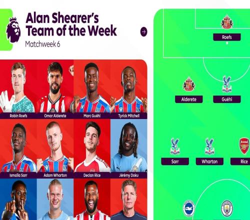 雷速体育9月30日报道宣称 英超名宿阿兰·希勒为英超官方评选了第6轮比赛的最佳阵容。帮助水晶宫战胜利物浦的中场球员亚当·沃顿得到希勒极高评价,格拉斯纳成为周最佳主帅,哈