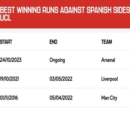雷速体育10月20日报道宣称 阿森纳俱乐部官网晒出的数据显示,过去6次面对西甲球队,阿森纳保持全胜,面对西班牙联赛球队胜率为41.9%。欧冠联赛第3轮,阿森纳将坐镇酋长球场与近期